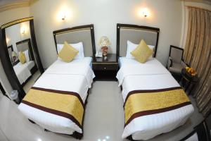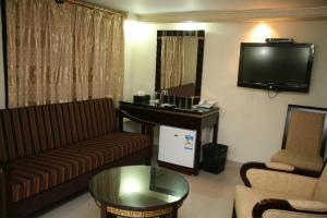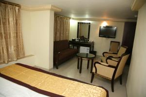 This air-conditioned room features a small seating area with two chairs. It includes a flat-screen TV, a minibar and an electric kettle and a shower box.