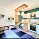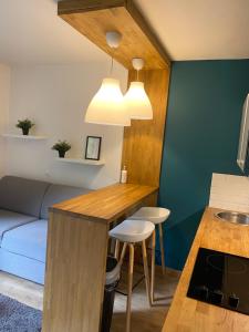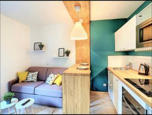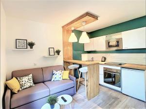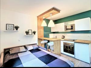 Das Centre Saint-Gervais Studio Vert moderne 2 pers proche télécabine verfügt über ein Schlafzimmer, einen Flachbild-TV und eine Küche.