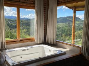 This chalet offers a fireplace. This chalet comprises 2 living rooms, 1 separate bedroom and 1 bathroom with a bath and free toiletries. The chalet's kitchen, which features kitchenware and a microwave, is available for cooking and storing food. Featuring a terrace with garden views, this chalet also provides air conditioning and a flat-screen TV with cable channels. The unit offers 1 bed.