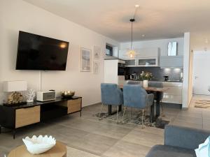 This apartment comes with 1 bedroom, a kitchenette with a dishwasher and an oven, a flat-screen TV, a seating area and 1 bathroom equipped with a walk-in shower. Rooms at the property feature soundproofing, tiled floors, and a fireplace. Chalet Möwenblick Rügen mit Meerblick, Sauna und Kamin includes an outdoor dining area.