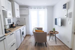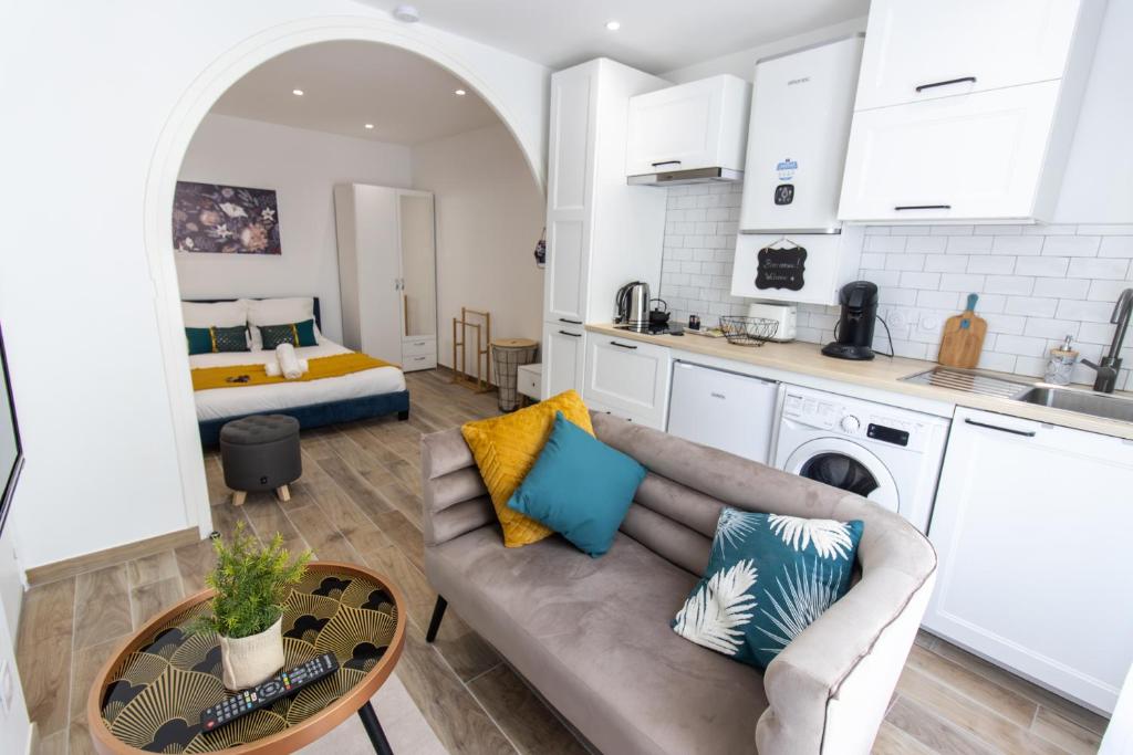 El apartamento Charmant Studio Climatisé 'Alma 1' - Béziers Centre - Wifi Fibre - Netflix cuenta con aire acondicionado, 1 dormitorio, sala de estar, cocina completa con nevera y cafetera, y 1 baño con ducha y artículos de aseo gratuitos. El apartamento Charmant Studio Climatisé 'Alma 1' - Béziers Centre - Wifi Fibre - Netflix dispone de toallas y ropa de cama.