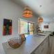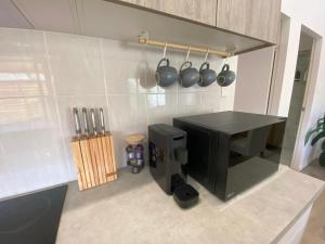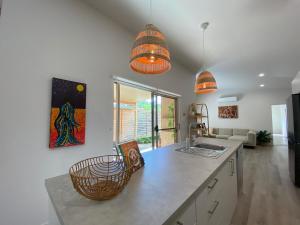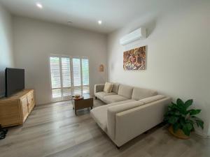 Das klimatisierte Charming Beach Getaway umfasst drei separate Schlafzimmer, eine voll ausgestattete Küche mit Kühlschrank und Geschirrspüler sowie zwei Badezimmer. Es gibt einen TV.