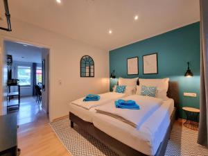 Apartmán Charysma - Azurro-Suite, urbanes & ruhiges Design, Terrasse, Parkplatz nabízí 1 ložnici, 1 koupelnu, plně vybavený kuchyňský kout s jídelním koutem a lednicí a obývací část s TV s plochou obrazovkou. Koupelna v Charysma - Azurro-Suite, urbanes & ruhiges Design, Terrasse, Parkplatz zahrnuje sprchu a toaletní potřeby zdarma. V ubytování ubytování jsou pro hosty připraveny ručníky a ložní prádlo.