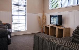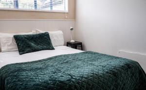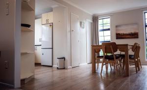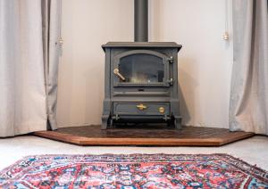 This heated apartment features a fully equipped kitchen with a stovetop and a microwave.