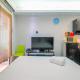 W apartamencie zapewniono sypialnię (1), kuchnię z lodówką i mikrofalówką, telewizor, część wypoczynkową oraz łazienkę (1) z prysznicem.