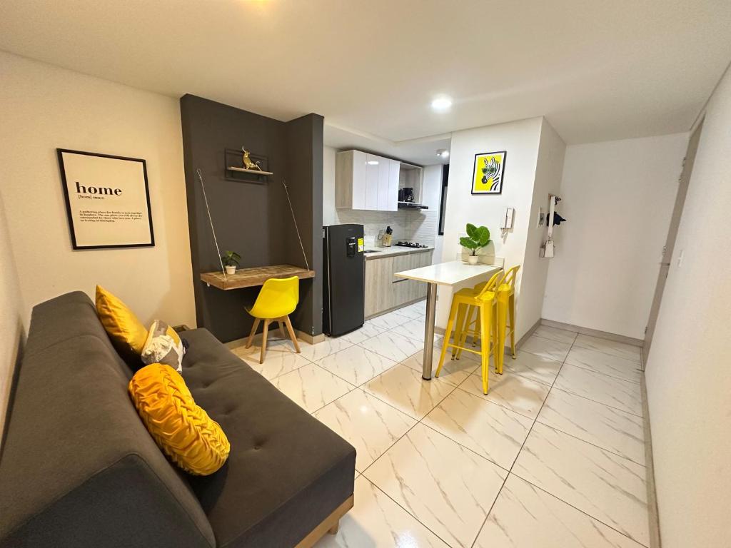 Accommodation at Copenhagen 604- Lindo apartaestudio al lado del CC Portal del Quindio includes 1 bedroom, a fully equipped kitchen, and 1 bathroom. A flat-screen TV is provided.