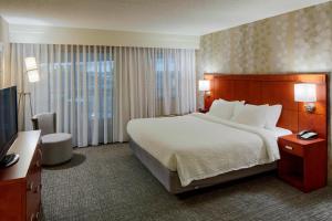 Camera con TV a schermo piatto, scrivania e macchina da caffè.