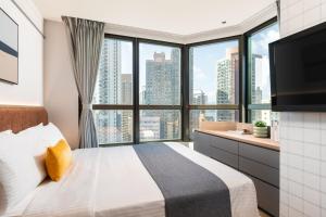 The double room provides air conditioning, a seating area, as well as a private bathroom featuring a shower and a hairdryer. The double room offers a safe deposit box, an electric kettle, parquet floors, a flat-screen TV, as well as city views. V této ubytovací jednotce je k dispozici 1 postel.