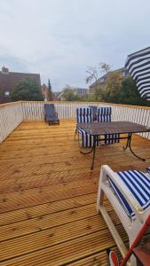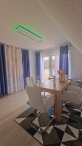 The spacious apartment is fitted with 2 bedrooms, 1 bathroom, a flat-screen TV with satellite channels, a dining area, a fully equipped kitchen, and a terrace with garden views. Fruits, chocolates, or cookies are provided for guests at the property. De Lux Wohnung includes an outdoor dining area.