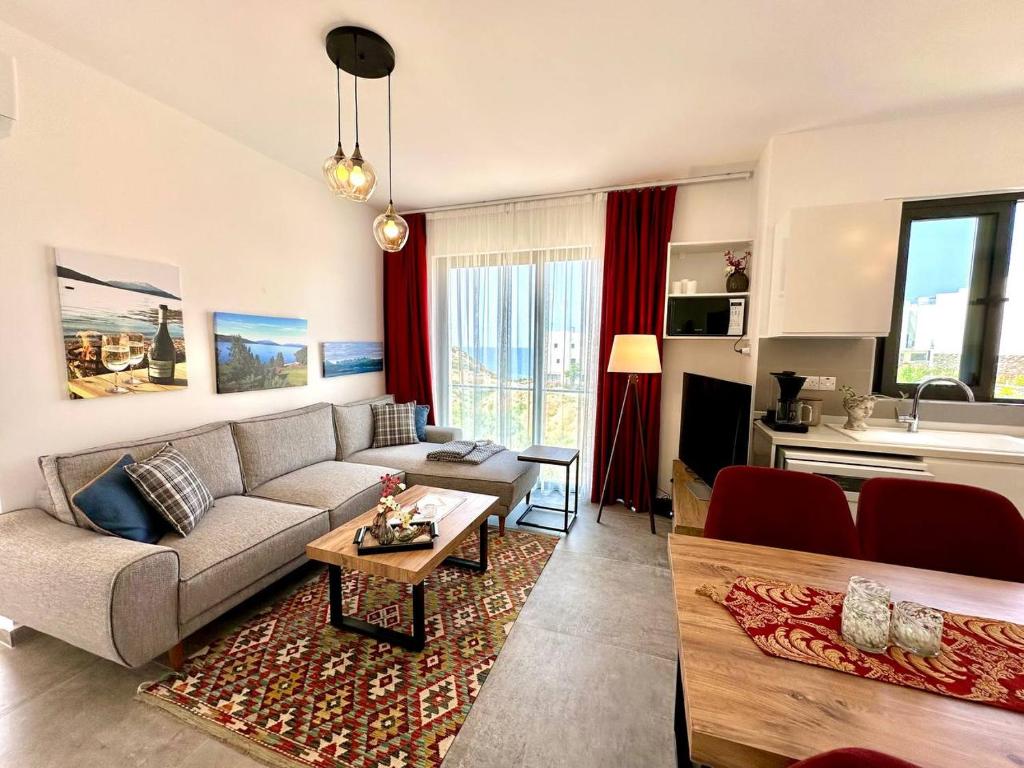 The well-fitted kitchen has a stovetop, a refrigerator, a dishwasher and kitchenware. The spacious air-conditioned apartment features a TV, a washing machine, a private entrance, a tea and coffee maker as well as sea views. The unit is furnished with 3 beds.