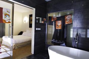 This room is decorated in an Asian style. It features a spacious bathroom with a bathtub.