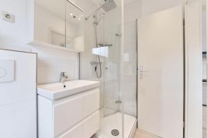 Apartament Direkt an der Perlebucht z tarasem posiada dwie sypialnie, dwie łazienki z prysznicem, salon z TV oraz kuchnię z lodówką i zmywarką. Obiekt Direkt an der Perlebucht oferuje widok na ogród. Ręczniki i pościel są dostępne w apartamencie.