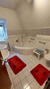 Cet appartement comporte 1 chambre, une cuisine avec un lave-vaisselle et un four, ainsi que 1 salle de bains avec une douche et des articles de toilette gratuits. Vous trouverez des serviettes et du linge de lit à Doppelzimmer im Einfamilienhaus, mit eigenem Bad und Küchenmitbenutzung.