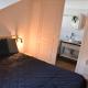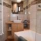 Die Küchenzeile ist ausgestattet mit einem Kühlschrank und einem Geschirrspüler, einem Ofen sowie einer Kaffeemaschine.