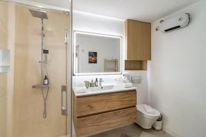 Questo appartamento comprende 2 camere da letto, una cucina con frigorifero e lavastoviglie e 2 bagni con doccia, asciugacapelli e lavatrice. Lenzuola e asciugamani sono a vostra disposizione presso EAC3F- Modern & light apartment steps from the sea.