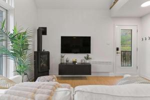 The hot tub and fireplace are the standout features of this chalet. Boasting a private entrance, this spacious chalet also comes with 2 separate bedrooms and 1 bathroom with a hairdryer. Guests will find a stovetop, a refrigerator, kitchenware and an oven in the well-fitted kitchen. The chalet also includes a barbecue. Featuring a patio, this chalet also features air conditioning, a tea and coffee maker and a TV. The unit has 3 beds.