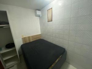 Das Enseada Nautico Residence DE PAULA bietet eine Terrasse mit Stadtblick, 1 Schlafzimmer, Wohnzimmer, Flachbild-TV, Küche mit Kühlschrank und Ofen sowie Bad mit Dusche.