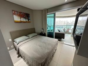 Climatizzato, Estanconfor Praia Santos 3 - AC garagem arrumação sacada fechada include 1 camera da letto, soggiorno, bagno e cucina attrezzata con forno e frigo. Asciugamani e lenzuola sono inclusi nei servizi di la struttura.