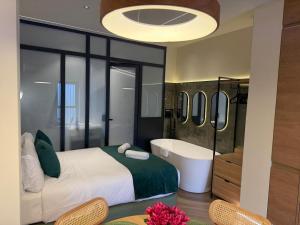 Ilość pokoi: 1This studio's special features are the hot tub and the spa bath. Providing free toiletries, this studio includes a private bathroom with a shower and a hairdryer. The fully equipped kitchen has a stovetop, a refrigerator, kitchenware and a microwave. This studio is air-conditioned and features a seating area with a flat-screen TV, a washing machine, a private entrance, a coffee machine, as well as a dining area. The unit offers 2 beds.
