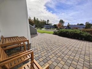 This apartment includes: - A living room with a sofa bed, dining area and a flat-screen TV. - Kitchen with a stove, fridge and dishwasher. - Bathroom with a shower and washing machine. - A furnished terrace.