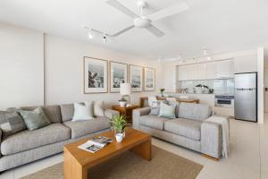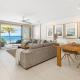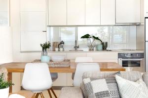 This apartment features a fully equipped kitchen, a dining setting and a lounge area.