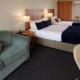 All rooms include a kitchenette with microwave and refrigerator, plus a dining table and sofa bed. A 32-inch flat-screen TV, air conditioning and heating are also included.