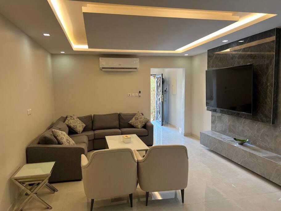 Klimatizovaný apartmán شقة عائلية غرفتين نوم وصالة ومطبخ-Family apartment with two bedrooms, a living room and a kitchen disponuje 2 ložnicemi, TV s plochou obrazovkou, jídelním koutem a kuchyní s lednicí a troubou.