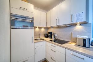 Apartmán v Ferienpark - Haus D, App 0D0808 zahrnuje 1 ložnici, obývací pokoj, 1 koupelnu a plně vybavený kuchyňský kout s lednicí a myčkou. Koupelna je vybavená sprchou.