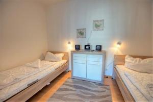 Apartmán v Ferienpark - Haus N, App 0N0603 zahrnuje 1 ložnici, obývací pokoj, 1 koupelnu a plně vybavený kuchyňský kout s lednicí a myčkou. Koupelna je vybavená sprchou.
