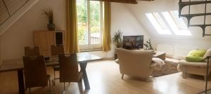 Apartmán Ferienwohnung im Grünen von Dresden nabízí 2 ložnice, 1 koupelnu, plně vybavenou kuchyň s jídelním koutem a lednicí a obývací část s TV s plochou obrazovkou. Apartmán ubytování poskytuje hostům ručníky a ložní prádlo.