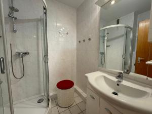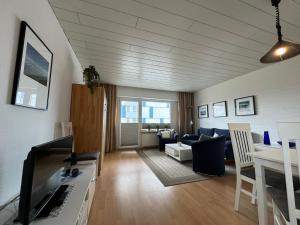 Apartmán má kabelovou TV a obývací prostor. Kuchyně v Ferienwohnung im Haus Nordland Nordland, App 82 1 Raum je vybavena lednicí, troubou a mikrovlnnou troubou, v koupelně je sprcha a fén.