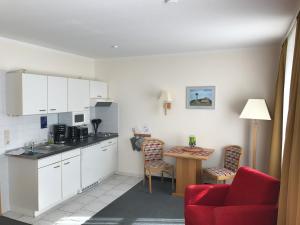 Apartmán má 1 ložnici, 1 koupelnu, TV s plochou obrazovkou s kabelovými programy, jídelní část a kuchyň s kompletním vybavením. Z balkonu ubytování Ferienwohnung 8 im Haus Hühnergott Sellin se nabízí výhled na město. V koupelně ubytování ubytování nechybí sprcha ani fén.