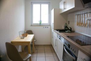 At Ferienwohnung in zentraler Lage und mit Balkon - Villa Karola FeWo 18, the 1-bedroom apartment includes a living room with a TV, a fully equipped kitchen with a dishwasher and oven, and 1 bathroom with a hair dryer.