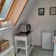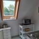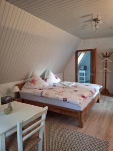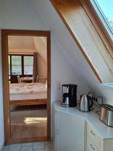 Apartmán má 1 ložnici, 1 koupelnu, ložní prádlo, ručníky, TV s plochou obrazovkou se satelitními programy, kuchyň s kompletním vybavením a balkon s výhledem do zahrady. V koupelně ubytování Ferienwohnung am Badesteig nechybí sprcha ani fén.
