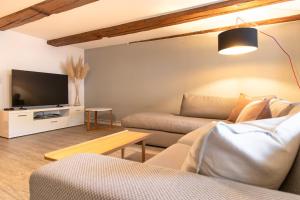 Ferienwohnung am Stadtschloss presenta 1 camera da letto, soggiorno con TV a schermo piatto, bagno con doccia e cucina con frigo e lavastoviglie. Ferienwohnung am Stadtschloss fornisce lenzuola e asciugamani ai propri ospiti.