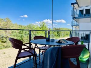 The spacious apartment is equipped with 2 bedrooms, 1 bathroom, bed linen, towels, a TV, a fully equipped kitchen, and a balcony with sea views. Ferienwohnung Marepineta im Haus Zudar Prora includes an outdoor dining area.