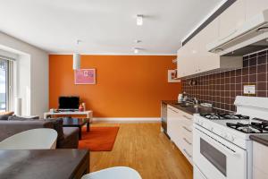 The apartment has 2 bedrooms, 1 bathroom and a kitchen. The apartment's kitchen is available for cooking and storing food. This apartment offers a washing machine and a flat-screen TV. The unit has 2 beds.