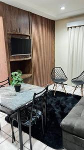 Im Flat Mobiliado na Beira Mar finden Sie eine klimatisierte Unterkunft mit 1 Schlafzimmer, Flachbild-Sat-TV, Essbereich, Küche mit Kühlschrank und Wohnzimmer.