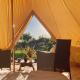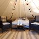 The luxury tent has an outdoor fireplace and a picnic area.