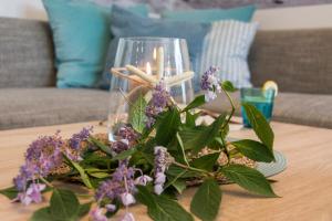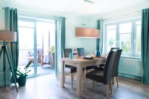The modern furnished apartment has a large balcony with views, a kitchen with dining area, a living room with sitting area, two bedrooms and a bathroom.