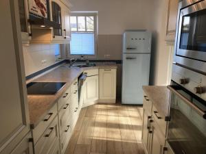 Prázdninový dům ubytování zahrnuje 3 ložnice, plně vybavenou kuchyň s lednicí a myčkou a 2 koupelny se sprchou. Koupelna v ubytování Friedenstrasse Haus Kranich je zařízena vanou a fénem.