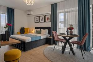 Klimatizovaný apartmán ubytování zahrnuje 1 ložnici, TV s plochou obrazovkou a kuchyň s lednicí a troubou. Apartmán Garsoniera Turquoise Rezidential Moghioros Park poskytuje hostům ručníky a ložní prádlo.