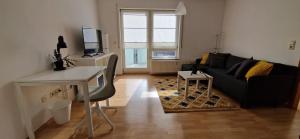 Apartament w Gemütliche 2-Zimmer-Wohnung mit Balkon mieści 1 sypialnię, salon, w pełni wyposażoną kuchnię z lodówką i ekspresem oraz 1 łazienkę z wanną i suszarką. Ręczniki i pościel są dostępne w apartamencie.