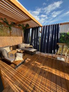 This holiday home features a hot tub. Boasting a private entrance, this air-conditioned holiday home features a kitchenette, 1 bedroom and 1 bathroom with a bath and a hairdryer. Meals can be prepared in the well-fitted kitchenette, which has a refrigerator, kitchenware and a microwave. Featuring a terrace with garden views, this holiday home also features a coffee machine and a flat-screen TV. The unit is equipped with 1 bed.