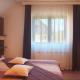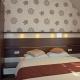 Room with a double bed, satellite TV and a bathroom with a shower.