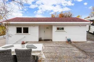 This self-catering holiday cabin is located on Håkøya Island, 17 km from Tromsø city center. With panoramic sea and mountain views, it's a two-bedroom cabin with a furnished terrace. As a small modern holiday home, it has an equipped kitchen, washing machine, a small seating area with a flat-screen TV and each bedroom has a separate bathroom. Also, please note that one bedroom is separated from the main cabin.