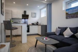 W apartamencie znajduje się sypialnia, salon, kuchnia z ekspresem i lodówką oraz łazienka z prysznicem i kosmetykami. Ręczniki i pościel są dostępne w apartamencie HANNIBAL - Design Apartment Lavendel 4, VW Nähe, Parkplatz, Küche, HighSpeed-WLAN, Fitness, Solarium.