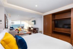 This apartment features a pool with a view and a hot tub. This spacious apartment includes 1 living room, 1 separate bedroom and 1 bathroom with a walk-in shower and free toiletries. Meals can be prepared in the well-fitted kitchen, which is fitted with a stovetop, a refrigerator, kitchenware and an oven. The air-conditioned apartment offers a flat-screen TV with streaming services, a washing machine, a private entrance, a tea and coffee maker as well as sea views. The unit has 2 beds.