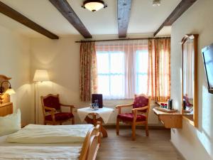 Country-style room with flat-screen TV, desk, seating area, and a bathroom with a hairdryer. Allergy-free bedding and towels are provided. Some rooms have a balcony or terrace.