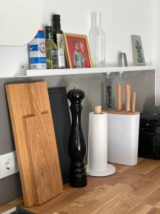 W apartamencie zapewniono sypialnię (1) oraz kuchnię z lodówką i ekspresem do kawy. Ręczniki i pościel są dostępne w apartamencie Haus mit Türmchen.